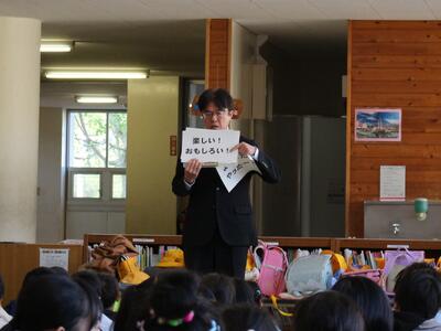 校長先生は、元気いっぱい、笑顔いっぱいの学校にするために、「こんな言葉を増やしたい」という話をしました。